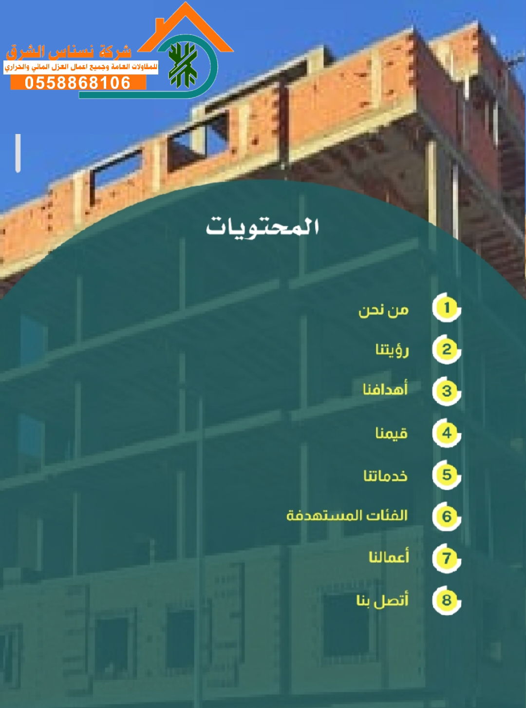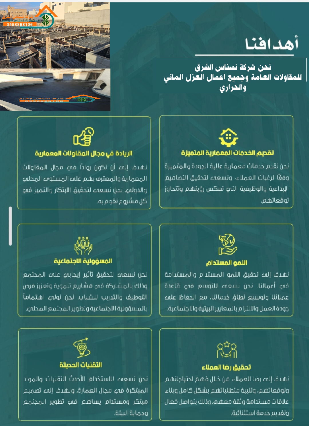 اضغط هنا لعرض قائمة الصور بأنواعهاتُعدّ شركة نسناس الشرق للمقاولات العامة وجميع أعمال العزل المائي والحراري من الشركات الرائدة في مجال المقاولات العامة والبناء في منطقة جدة. نحن نقدم خدمات متكاملة وشاملة تشمل تصميم وتشييد المباني، تنفيذ المشاريع وفق أعلى المعايير، تقديم حلول مبتكرة ومتخصصة في العزل المائي والحراري، وضمان الجودة في جميع مراحل العمل. تتميز فرق العمل لدينا بالخبرة الواسعة والإحترافية العالية لتحقيق تطلعات عملائنا وتقديم أفضل النتائج التي تتوافق مع احتياجاتهم وأهدافهم.