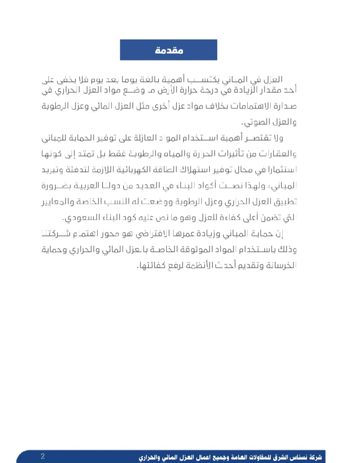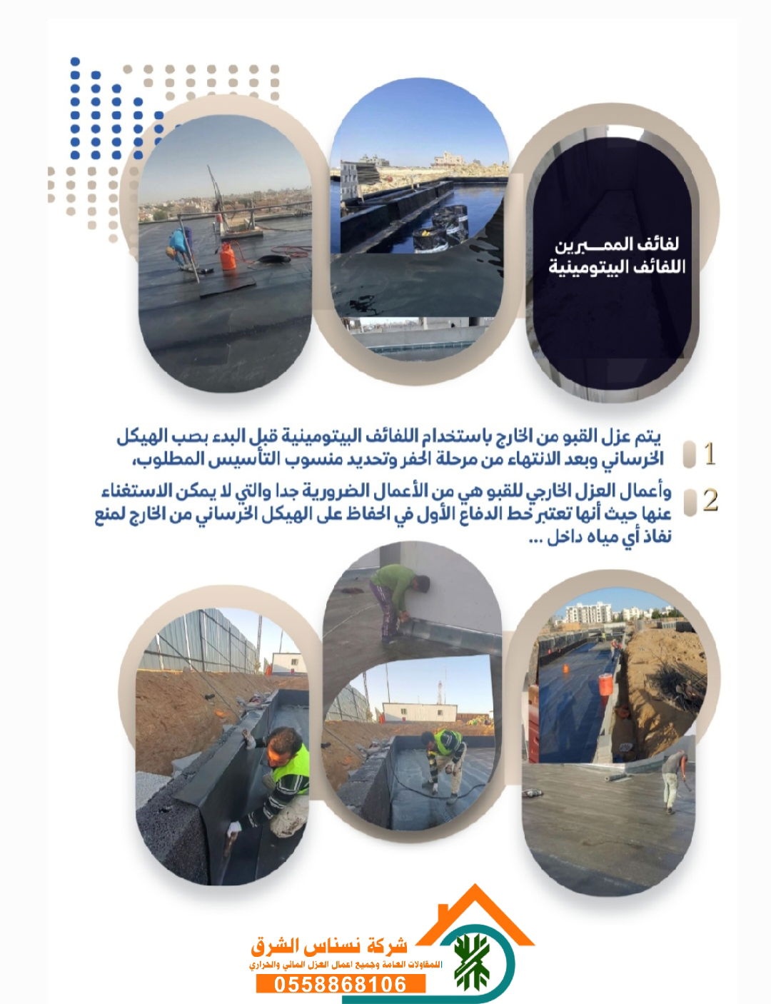 أهمية عزل الخزانات تعد أعمال الخزانات ذات أهمية عالية للا سباب التالية: الحفاظ على المياة من الهدر وترشيد استهلاكها 2 المحافظة على أساسات المباني والعقارات من التضرر بسب تسرب المياة إلى مواد التسليح 3 المحافظة على الطرق المجاورة للخزانات من التضرر بسسب تسريب المياة وتاثيرها على التربة (الدفان) 4 المحافظة على المياة من التلوث نتيجة تسريب المياة من إلى الخزانات الأرضية 5 تخفيف العبء الاقتصادي على المستهلك بخفض كمية استهلاك فواتير المياة