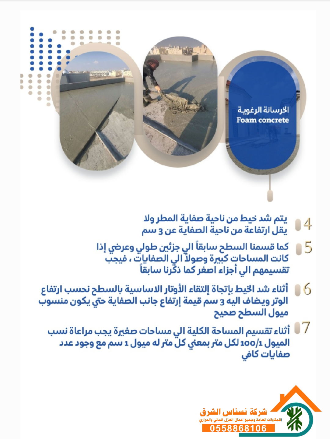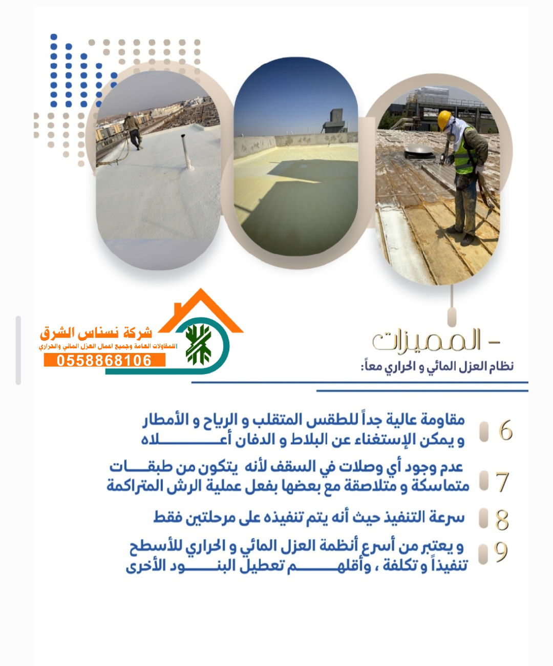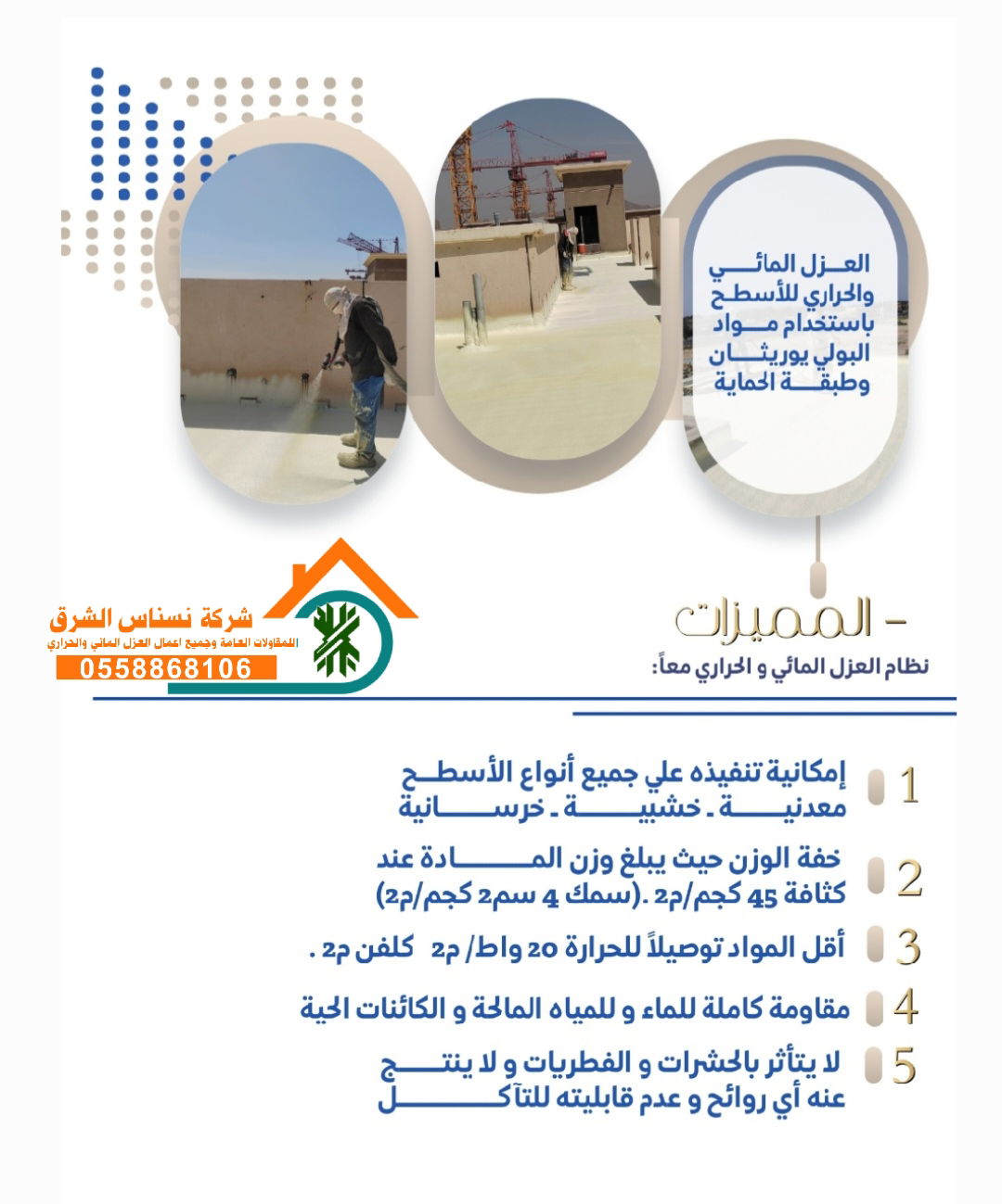 شركة نسناس الشرق للمقاولات العامة وجميع اعمال العزل المائي والحراري تعتبر من الشركات الرائدة في توفير خدمات متعددة ومتنوعة في مجال العزل المائي والحراري. نحن نقدم حلولاً متخصصة في تحديث وصيانة المباني بما يضمن الحفاظ على جودتها وتقليل التأثيرات البيئية السلبية. يتميز العزل المائي والحراري بكفاءته في الحفاظ على بيئة داخلية مريحة، تقليل استهلاك الطاقة، ومقاومة العوامل الخارجية المؤثرة.